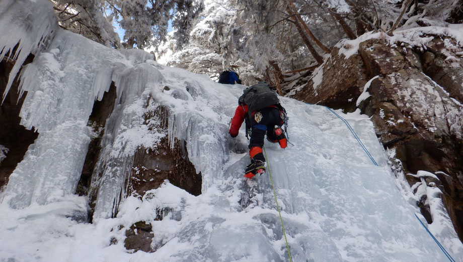 冬季の氷壁に挑むアイスクライミング